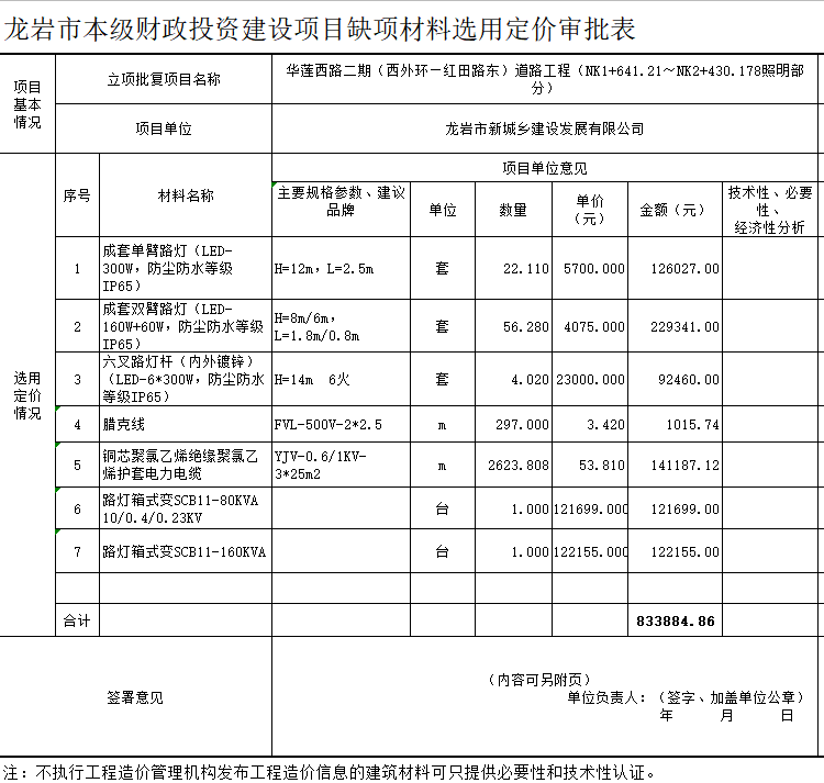 华莲西路二期(西外环—红田路东)道路AYX爱体育(NK1+641.21~NK2+430.178照明部分)缺项原料选用定价审批表公示Time:2020-11-03龙岩市本级财政出资建筑项目缺项原料选用定价审批表(黉门桥改造AYX爱体育) - 补充公示