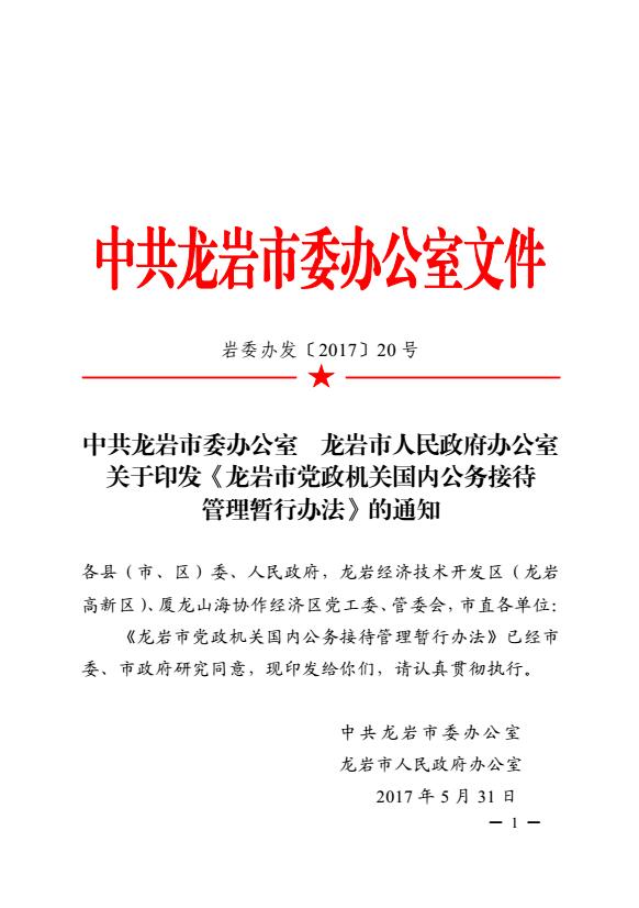 市委办、市政府办关于印发《龙岩市党政机关国内公务接待管理暂行办法》的通知(岩委办发【2017】20号)