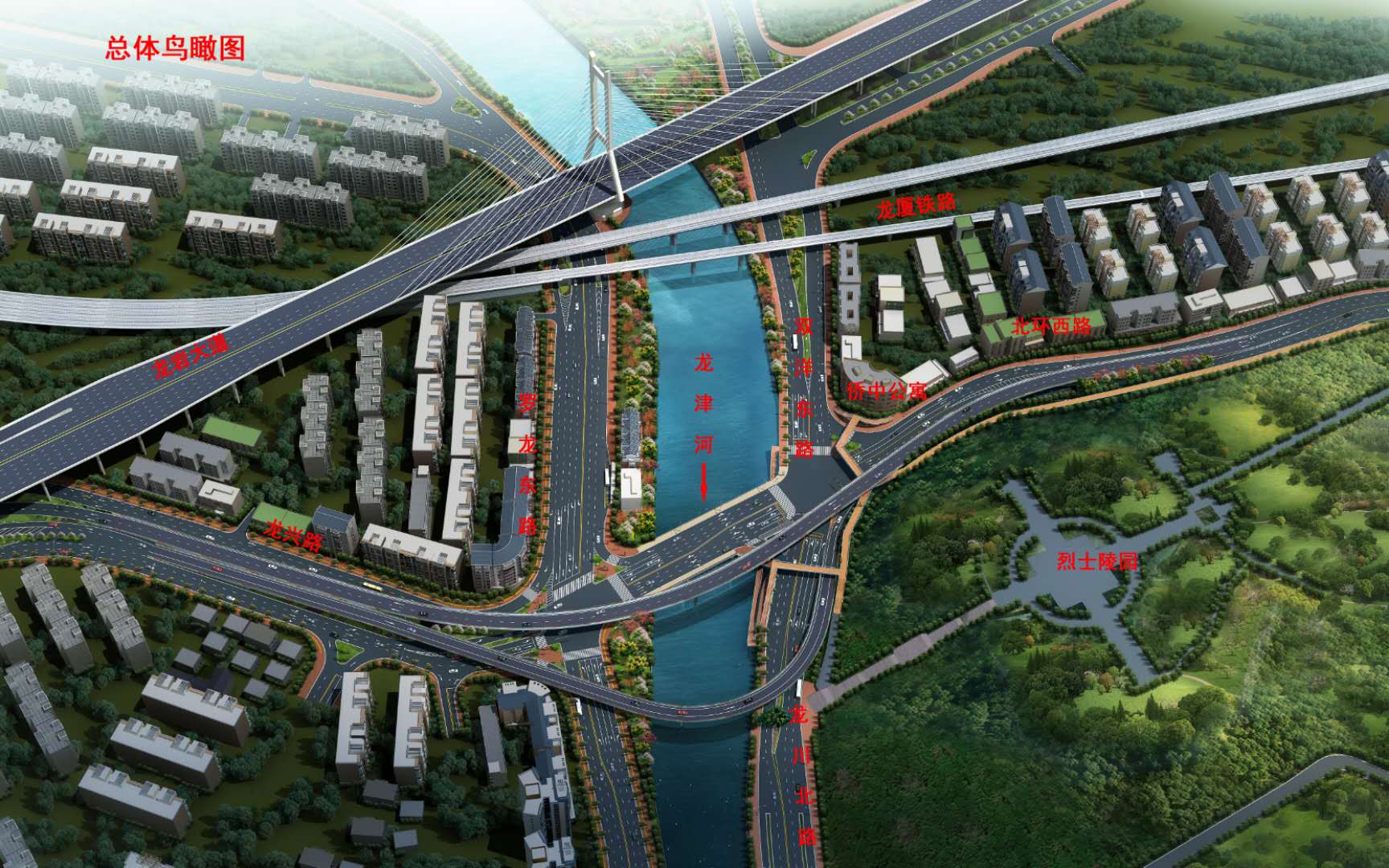 沿北环西路、龙兴路设置南北分离式双向四车道高架,南侧接龙兴路,北侧接现状北环西路,高架靠东侧布置(紧贴烈士陵园),桥梁总长约1140米,净宽约7.7米;在双洋路、龙川北路、北环西路设置人行天桥,与山体步道衔接,以完善慢行系统;在烈士陵园山体下采用明挖回填方式设置框涵,长度约225米,净宽10.75米。