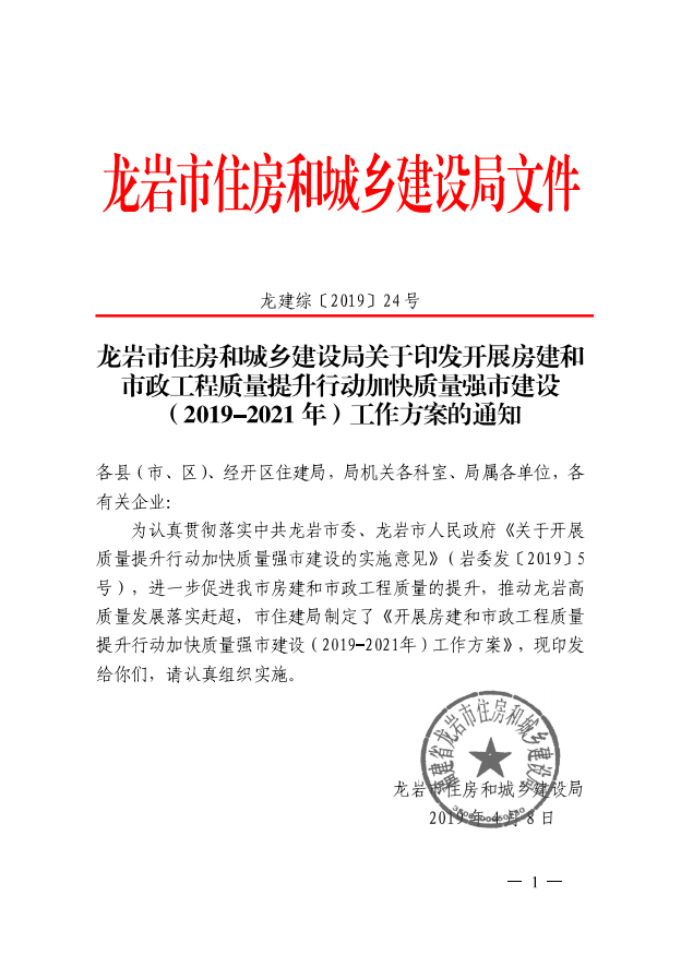 龙岩市住房和城乡建筑局关于印发开展房建和市政AYX爱体育质量提升行动加快质量强bob综合体育官网app下载设(2019-2021年)工作方案的通知