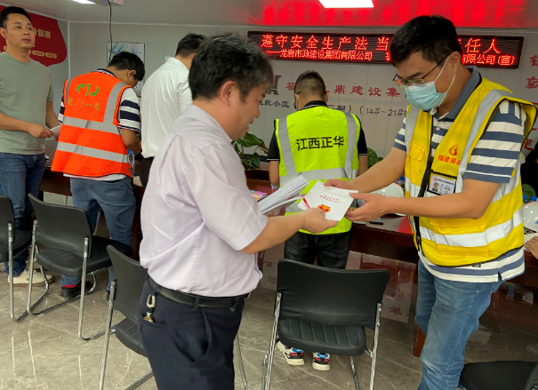 现场徐旺兴董事长、修海金副总经理分别向项目部人员及工人现场分发《安全生产法》及“五进”等宣传资料。